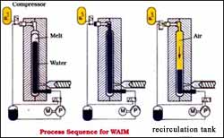 The Principle of WAIM is similar to sandwich injection molding. The process can be easily understood from the figure and the steps involved are as below: